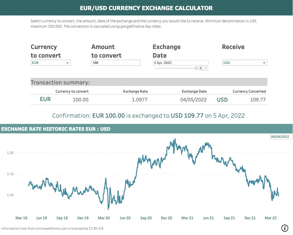 Below you see what the Tableau Currency Exchange calculator looks like. I kept it simple and made it recognizable as a financial tool by using green tones also often used by banks around the world.