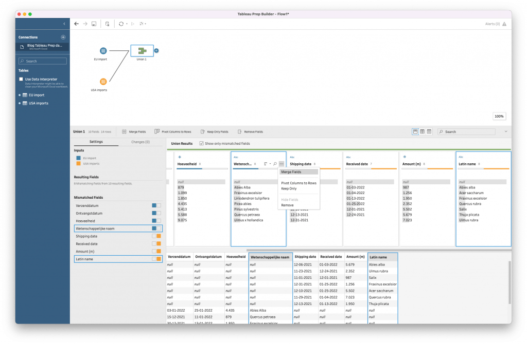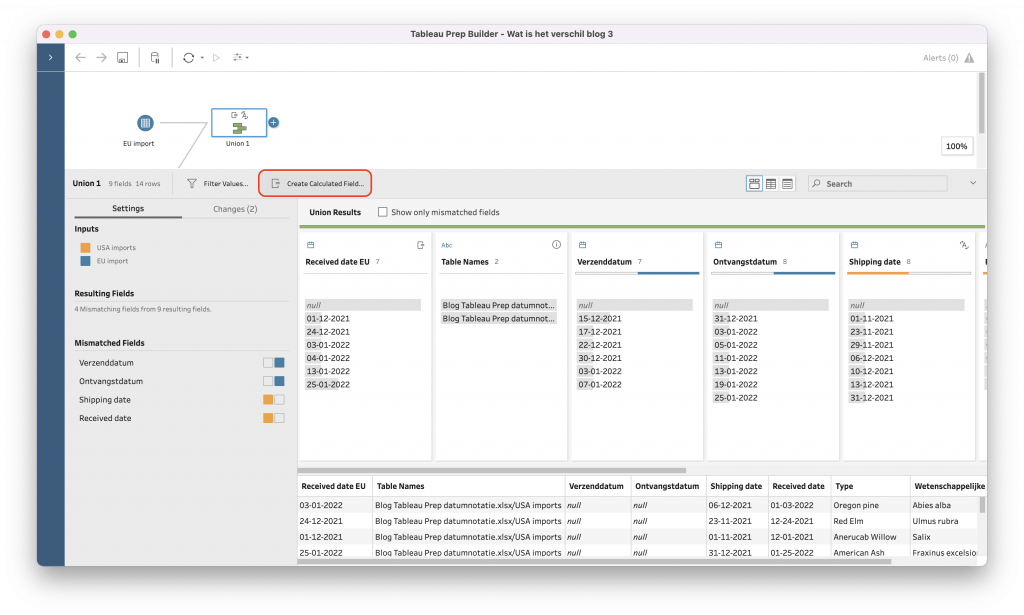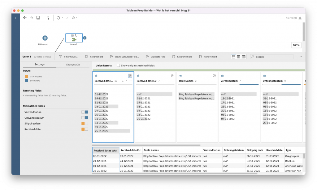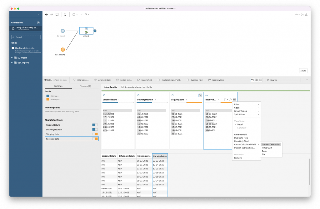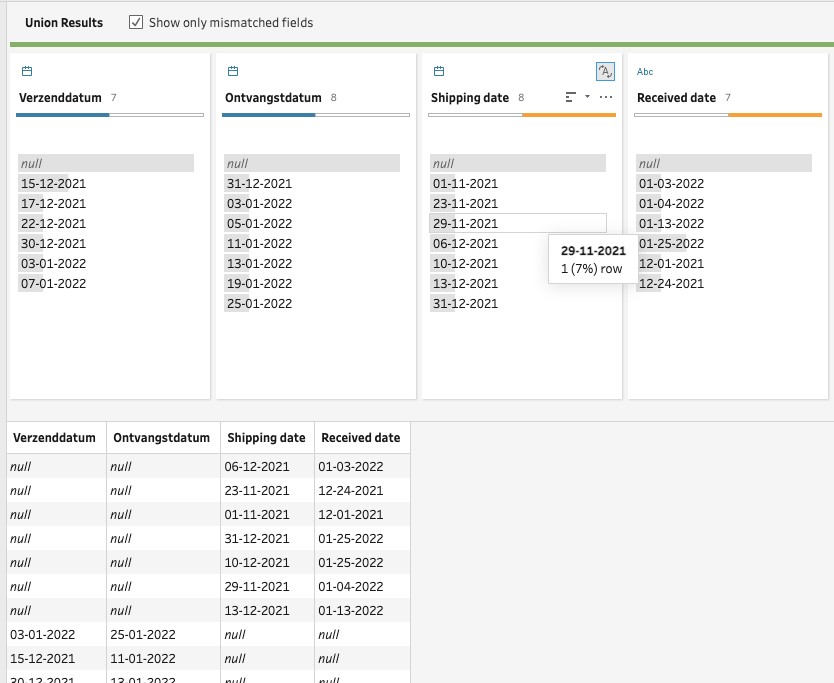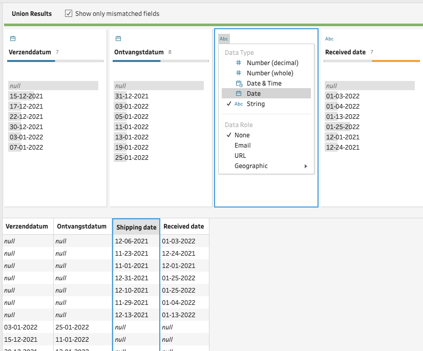 Maar wat te doen met ‘Shipping date’ , een string value, en een Verzenddatum, een datum. Klik op ‘Abc’ linksboven in de kolom, hierna er komt een uitklapmenu. Selecteer ‘Date’, vervolgens vormt Tableau Prep de Amerikaanse notatie automatisch om naar de Europese. Vervolgens kan de bovenstaande merge-functie toegepast worden. Daaruit volgt het onderstaande resultaat: