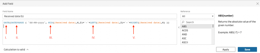 - DATE(DATEPARSE(“yyyy-MM-dd”,IFNULL(STR([Received date EU]),STR([Ontvangstdatum]))))