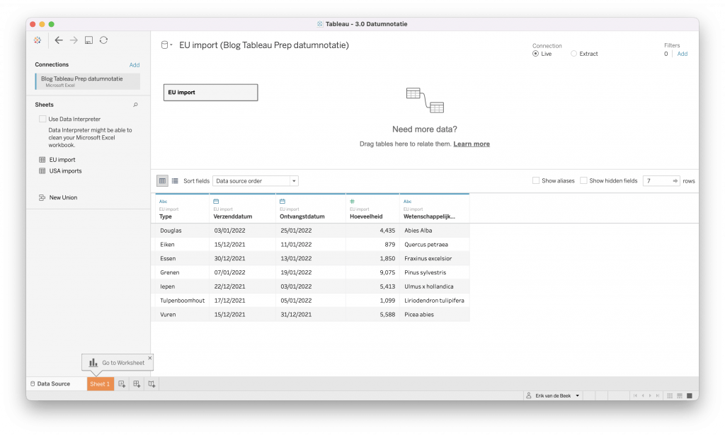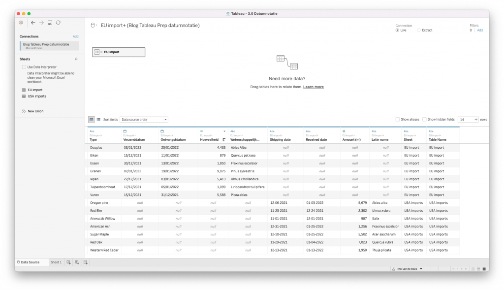 In Tableau Desktop kan via de functie union (voor meer informatie over unions, zie deze link). Voor dit voorbeeld is gebruik gemaakt van een Excel-bestand waarin de Europese en Amerikaanse lijst op verschillende tabbladen staan. Als u contact legt met de bron en één van de tabbladen het veld insleept ziet het er als volgt uit: