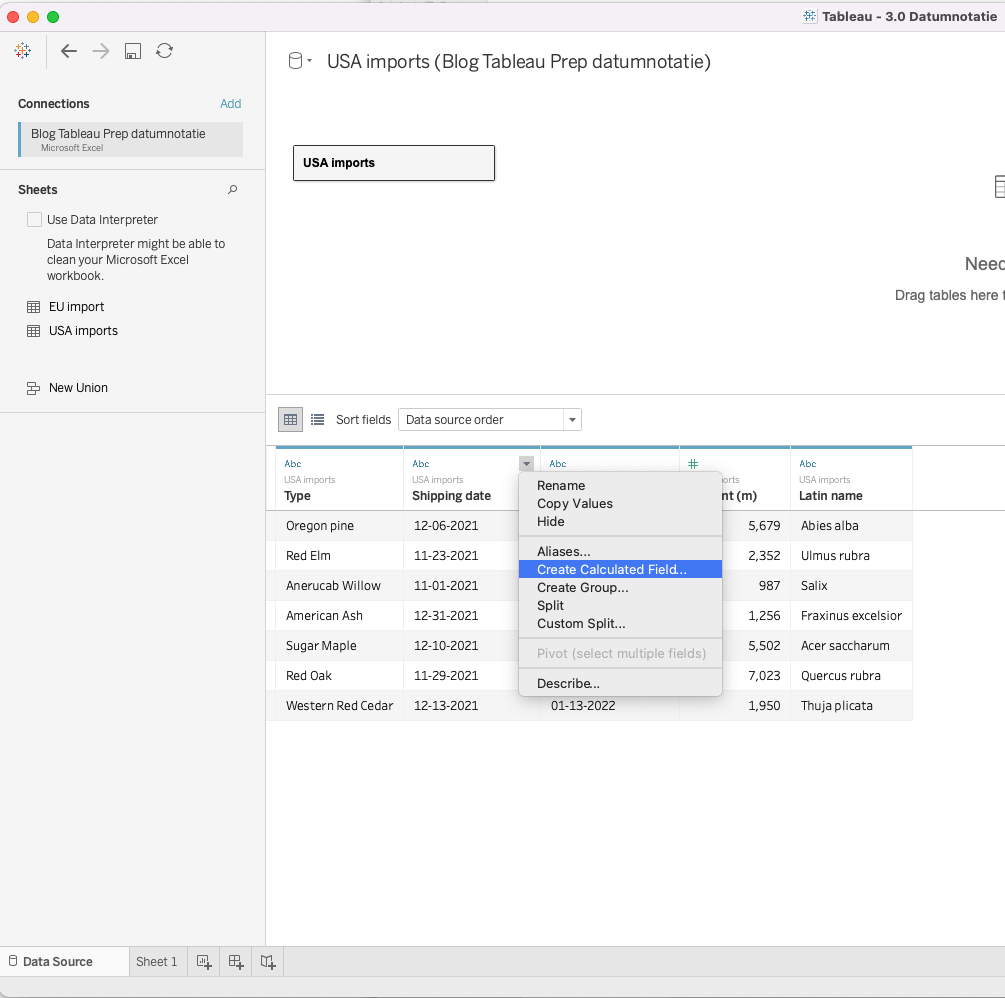 Om in de Data Source Page de Union goed uit te voeren zult u eerst de kolom ‘Shipping date’ moeten aanpassen, dit kan via een calculated field. Door op het pijltje/driehoekje te klikken dat verschijnt als u met de muis over de kolomkop zweeft kunt u calculated field selecteren (zie hieronder links). Vul vervolgens de formule in zoals rechtsonder: