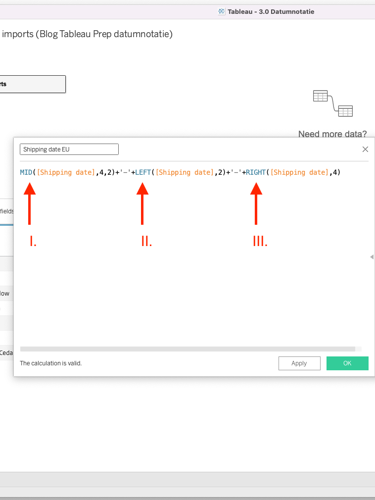 • DATE(DATEPARSE ( “dd-MM-yyyy”, MID([Shipping date],4,2)+’-‘+LEFT([Shipping date],2)+’-‘+RIGHT([Shipping date],4) ))