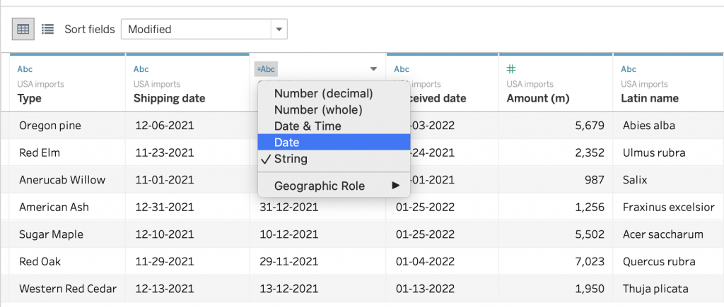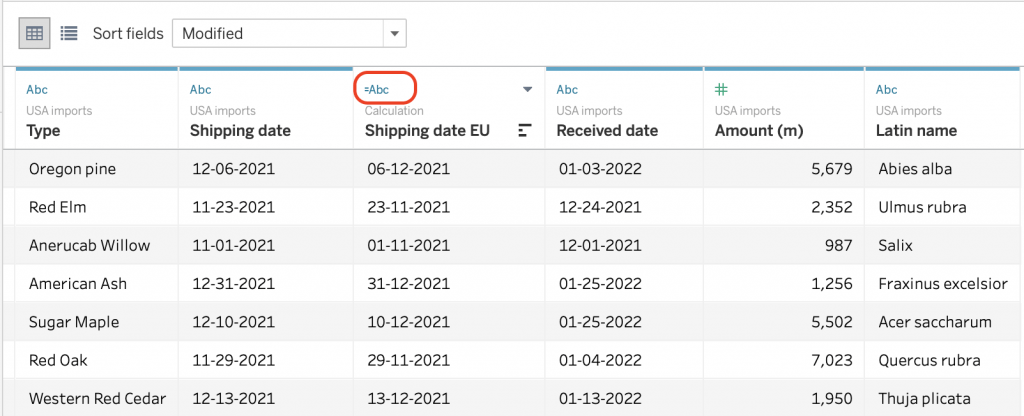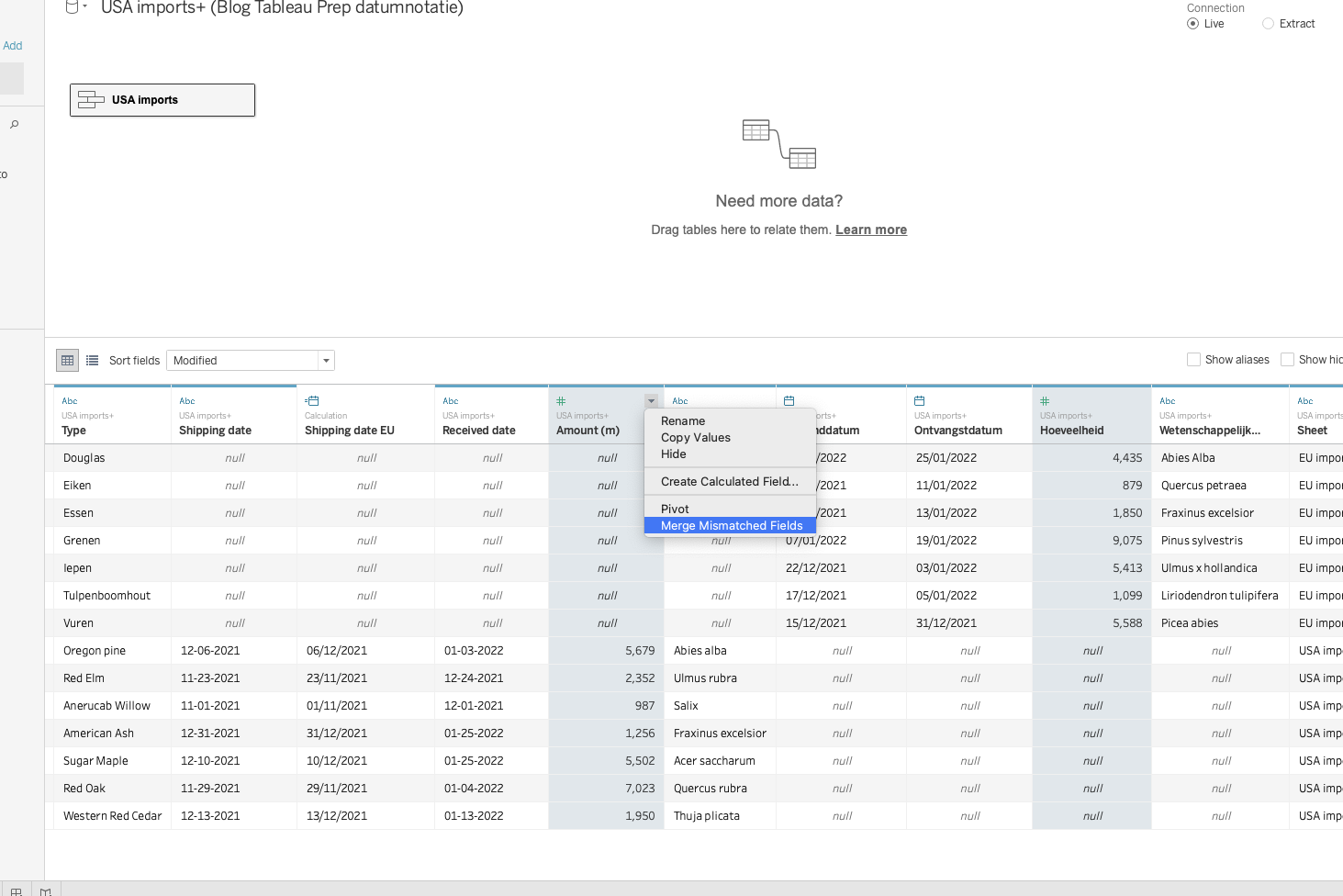 Stel een bedrijf dat hout importeert uit verschillende EU-landen en de VS ontvangt de onderstaande twee bestanden met transportgegevens. De linker tabel bevat gegevens met de Europese datumnotatie (dag-maand-jaar of dd-mm-yyyy). De rechter tabel de Amerikaanse notatie (maand-dag-jaar of mm-dd-yyyy). Voor het totaaloverzicht moet dit in één worksheet komen zonder dat er in het worksheet zelf met calculated fields gepuzzeld moet worden. (Het is namelijk handig als elke Tableau-gebruiker dezelfde kolomnamen gebruikt en in het algemeen dezelfde gegevens ontvangt).