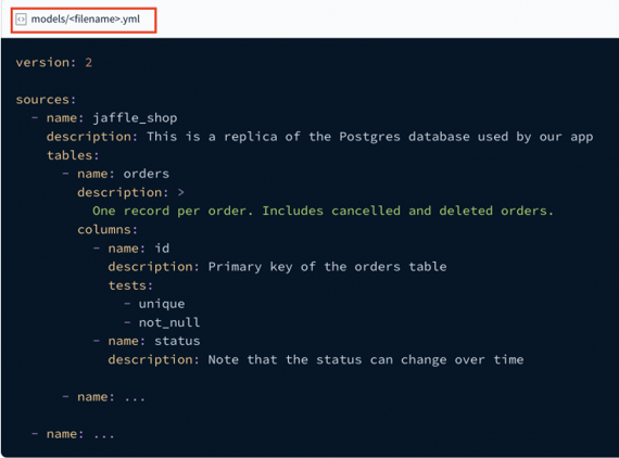 Sources in dbt bevinden zich in het ‘dbt_project.yml’ onder de Models subfolder. Aan te raden is het template (YAML bestand) van dbt zelf te gebruiken als uitgangspunt en deze verder aan te vullen naar wens. (Deze kun je hier vinden: