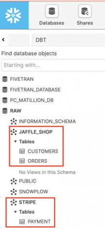 Een Source configureren in dbt betekent simpelweg een databron (schema, tabel etc..) vanuit een onderliggend database zoals Snowflake, Postgres etc., in dbt ‘binnen brengen’/importeren. In ons geval, werken we met Snowflake als onderliggende database. In dit voorbeeld gaan we de volgende tabellen vanuit Snowflake in dbt brengen als Sources: