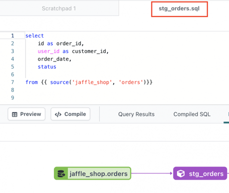Zo creëer je bijvoorbeeld een nieuw model (‘stg_orders) in dbt wat refereert naar de ‘Orders’ tabel die in je Source bestand leeft: