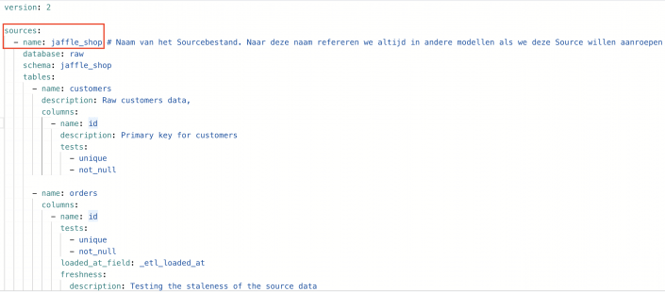 Je roept een Source aan bij ‘zijn naam (source_name)’ (in ons geval, ‘Jaffel_shop’) die je aan die source hebt gegeven tijdens het configureren van het Source bestand. Vervolgens geef je aan welke tabel binnen dat Source bestand, je in dbt wil gebruiken.