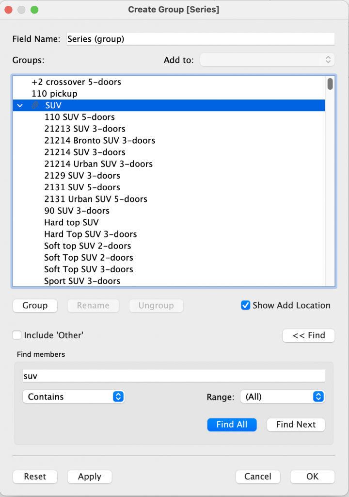 After pressing “Group”, all the selected members will be grouped. The newly created group can immediately be named as well. I named it “SUV”. Under this group, all members containing the word ‘suv’ is grouped. To reduce the number or unique members, I will continue grouping under common names for the other members. As the list gets smaller, it is easier to identify what you want to group. The newly created groups can be collapsed for having less members in your list and improve readability.