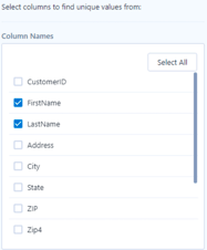 Ik sleep de Unique Tool nu in mijn work flow en verbind hem met de Data Input Tool. In het configuratie window zien we een lijst van te selecteren velden. Laten we in eerste instantie kijken of er duplicaten zijn op de combinatie van FirstName en LastName. Ik selecteer die twee velden en run de work flow.