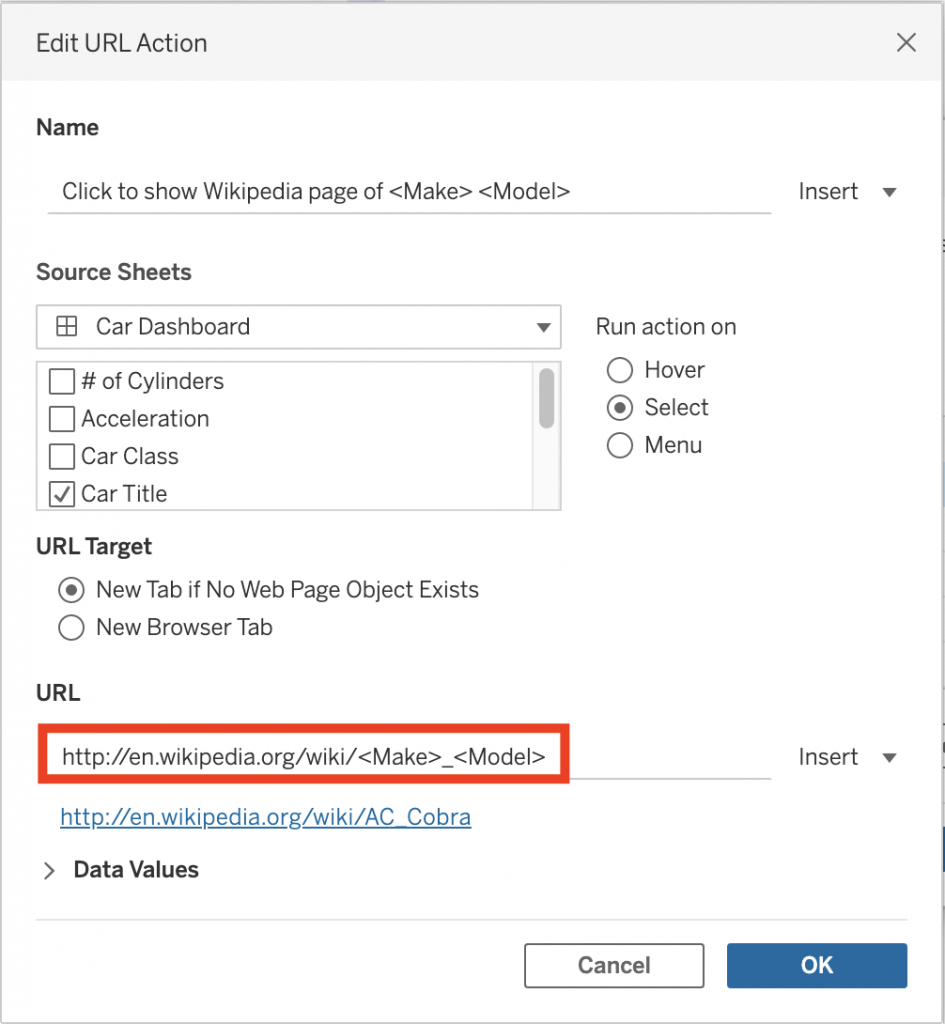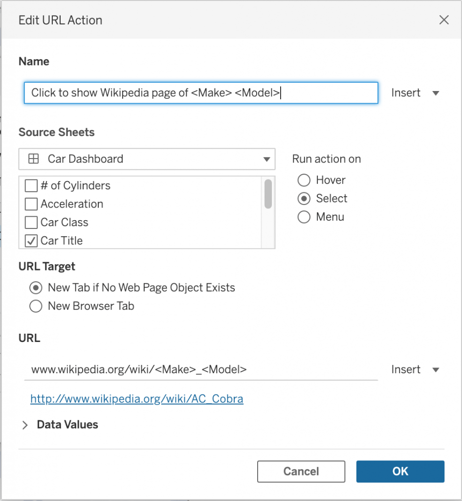 Recently I created a dashboard visualising the specifications of certain cars which can be seen here on my Tableau Public account. In this dashboard, I wanted to have the functionality to implement a simple dynamic URL action where when you click the generated car title, it would take you to the relevant Wikipedia page.