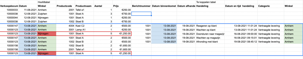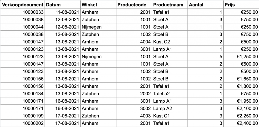 Stel u heeft een bedrijf dat meubels maakt en die verkoopt in drie winkels in Gelderland. Er is software met boekhouddata en leveringsformulieren, de tabel met leveringen heeft ‘Verkoopdocumentnr.’ als key en ziet er zo uit: