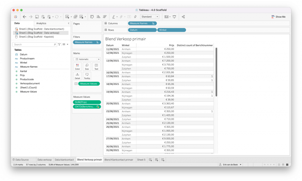 Bij een blend waarbij de velden ‘Datum’ en ‘Winkel’ de koppeling vormen ziet het er dan zo uit: