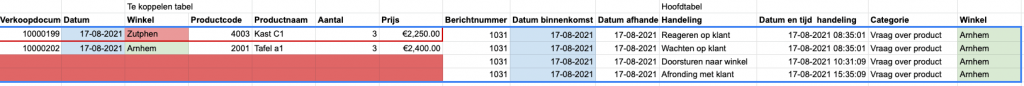 Wat zien we hierboven? Links in de hoofdtabel met de kolommen ‘Verkoopdocument’ tot ‘Prijs’, rechts de secundaire of volgtabel met de kolommen ‘Berichtnummer’ tot ‘Winkel’. De blend vindt plaats op de datum (13-08-2021), maar er is voor die dag geen bericht binnengekomen voor Nijmegen of