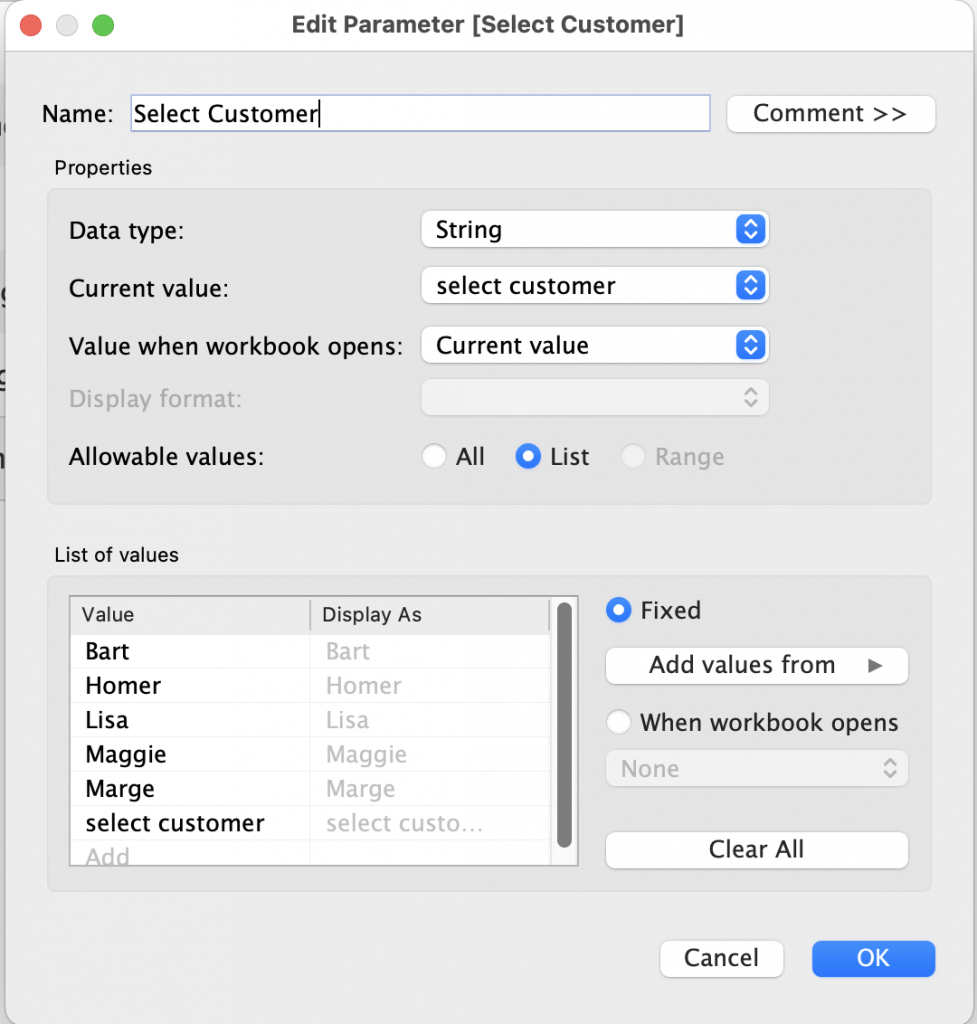 Ik rechts klik in het data pane en kies “Create Parameter”. De parameter geef ik direct een duidelijke naam: “Select Customer”. Ik zet het datatype op “String” en kies bij Allowable values voor “List”. Deze lijst vul ik met Customers door “Add values from >”.