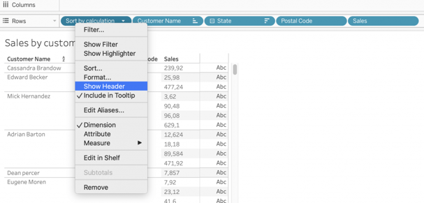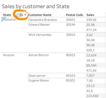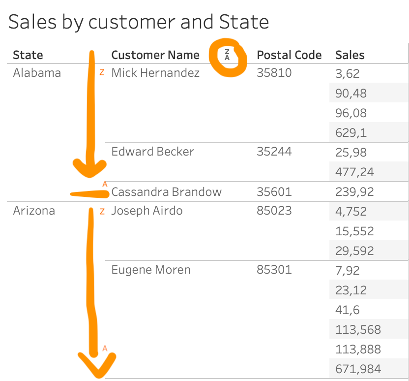 Als het te zien is, wat de sorteerfunctionaliteit wel doet is om Customer Name en de fields die op zijn rechts zitten te sorteren, maar State blijft in dezelfde order. Dit gebeurt omdat State op een hogere Level of detail dan Customer Name is en het aan zijn linkerkant zit.