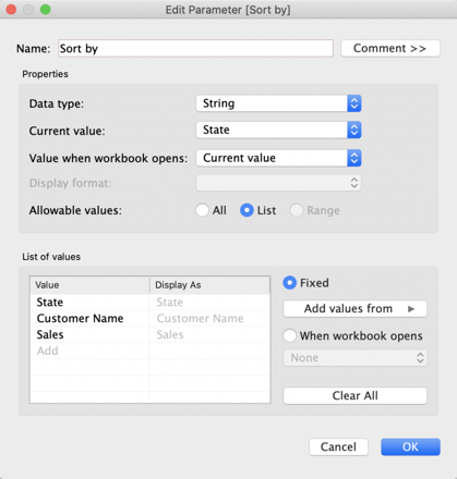 - Creër een “Sort By” parameter: Creër een string parameter en voeg de namen van de kolommen toes als values.