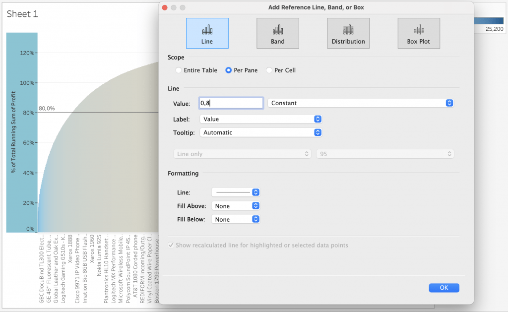 Next, to highlight the 80% line, the best method I can do is to add a reference line to the view. For this, right click the y-axis on the view and select “Add Reference Line”. Plot in the configuration below and you should have a line showing the 80% line on the y-axis.