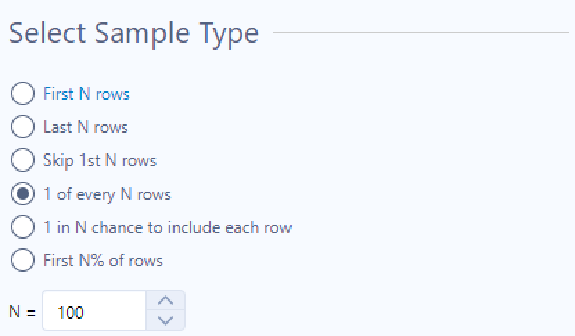 Het is vaak niet nodig om de hele dataset te gebruiken tijdens het testen en bouwen van je workflow. Door slechts een deel van de data te gebruiken kan je de verwerkingssnelheid aanzienlijk versnellen. Met de Sample Tool kan je zelf een gedeelte van de dataset selecteren, bijvoorbeeld de eerste 100 rijen. Dit is natuurlijk geen willekeurige set, maar voor het testen van een flow maakt dat niet altijd uit.