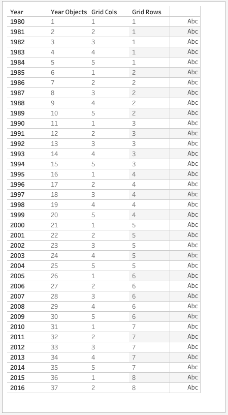 In order to have all 37 maps displayed in our visualization, we would need to construct a grid with 40 cells (5 columns x 8 rows). The construction for such a grid will be based on 3 calculated fields where we basically assign a column and a Row to each year’s map.