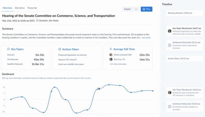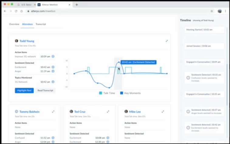 De meeste elementen in de overview zijn aan te klikken voor extra informatie (drill down). Zo kan je per aanwezige zien hoe lang die sprak, wanneer precies, waarover en wat het sentiment was op die momenten.