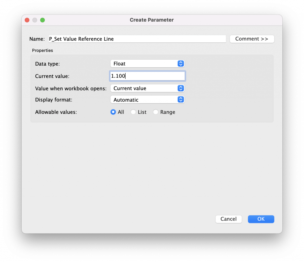 Klik op de referentie-lijn met de linkermuisknop en selecteer ‘Edit’. Selecteer als ‘Value’ de parameter die u zojuist heeft aangemaakt. Het label kan uitgezet worden, wat de vorm van de lijn en de opvulling betreft kan naar keuze wat uitgezocht worden.