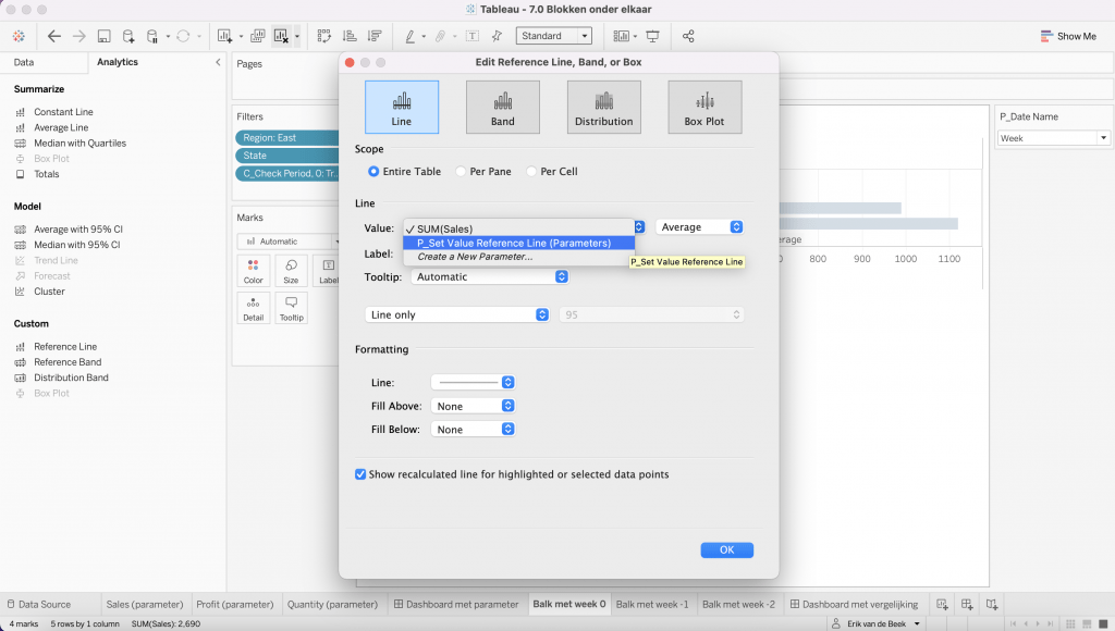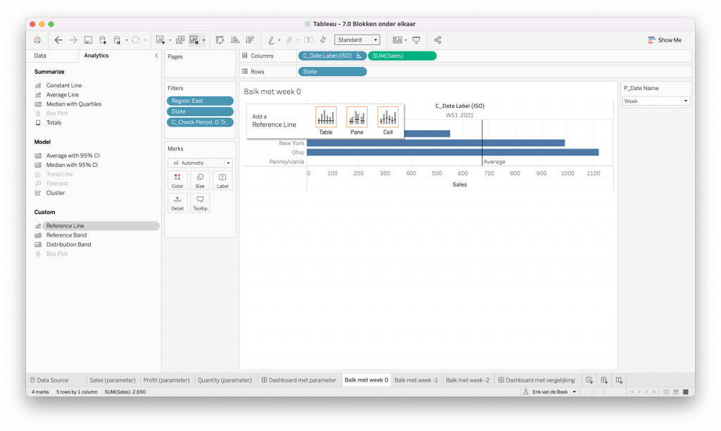 Klik op het tabblad links in het scherm, uiterst links staat het ‘Data Pane’. Rechts daarvan het ‘Analytics Pane’, klik op het laatste. Selecteer daar ‘Reference Line’ en sleep dit het scherm in.