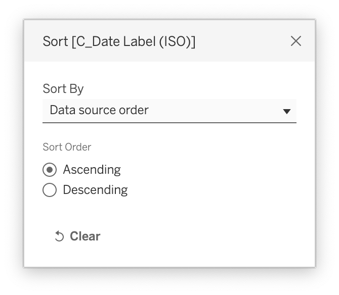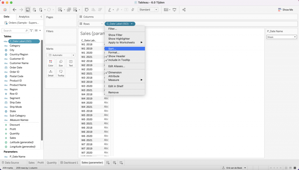 Klik op de ‘C_Date Label (ISO)’ -pil die op Rows staat, er verschijnt rechts een driehoekje dat uitgeklapt kan worden. Selecteer vervolgens ‘Sort’ (zie onderstaand).