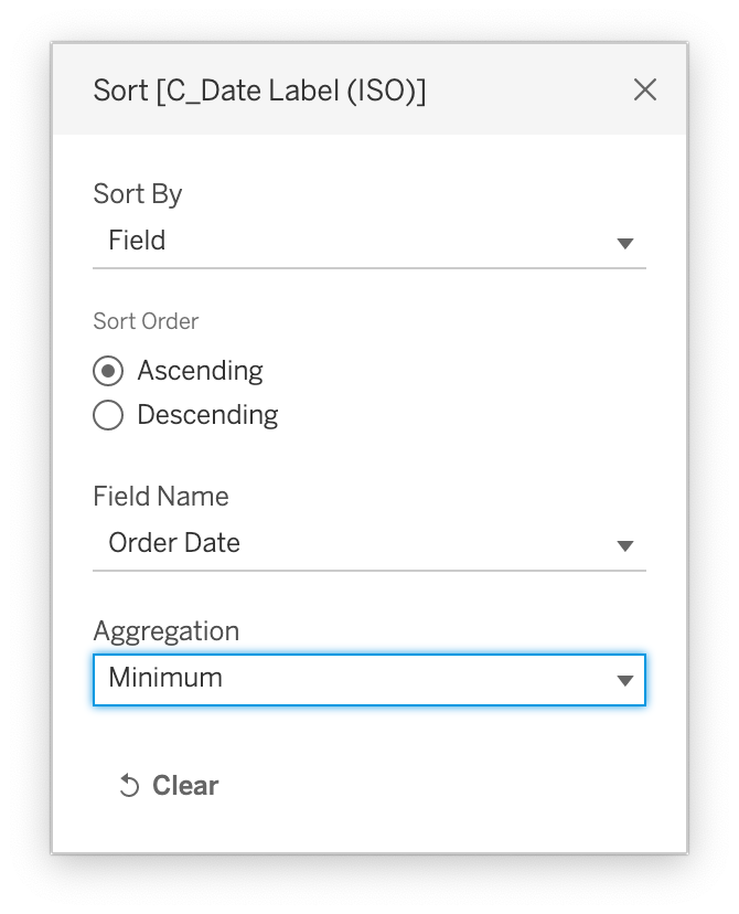 • Field Name: Het veld dat het ijkpunt is, in dit geval ‘Order Date’, in het vorige blog kunt u lezen dat dit veld de basis voor “C_Date Label (ISO)” is.
