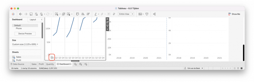 Dit (nogal simpele) dashboard laat in alle drie de worksheets/grafieken een andere measure zien met dezelfde datum-eenheid (Order Date), maar om van Datepart ‘Year’ naar ‘Quarter’ te gaan moeten er twee dingen gebeuren zoals in de onderstaande afbeelding: