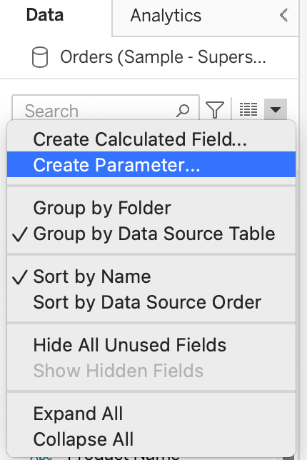 Maak vervolgens de parameter zichtbaar door op de pil ‘P_Date Name‘ te klikken en ‘Show Parameter‘ te selecteren.