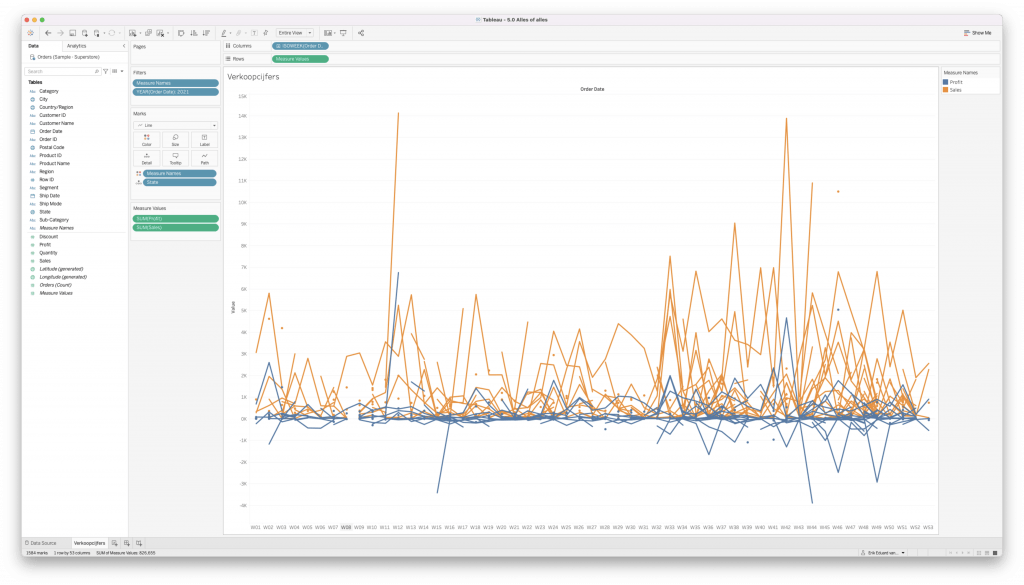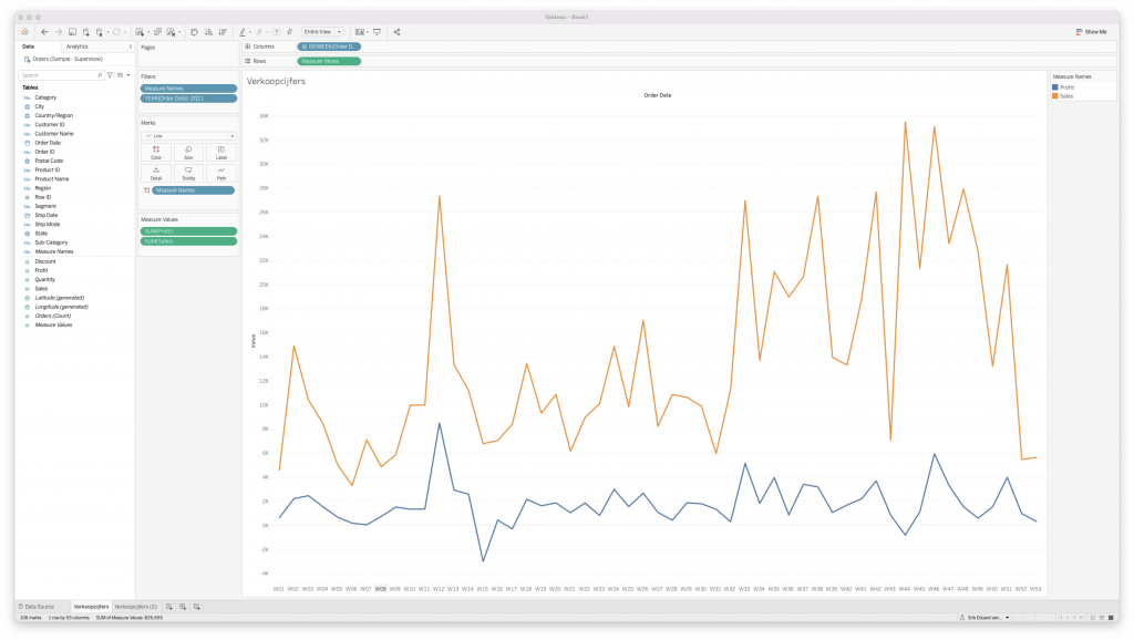 Als voorbeeld gebruik ik hieronder de Orders data van Superstore. Stel dat de vraag is hoeveel omzet en winst er geboekt is in het jaar 2021 met Iso-week als tijdeenheid (Dimension, Date Part). Het worksheet ziet er dan als volgt uit: