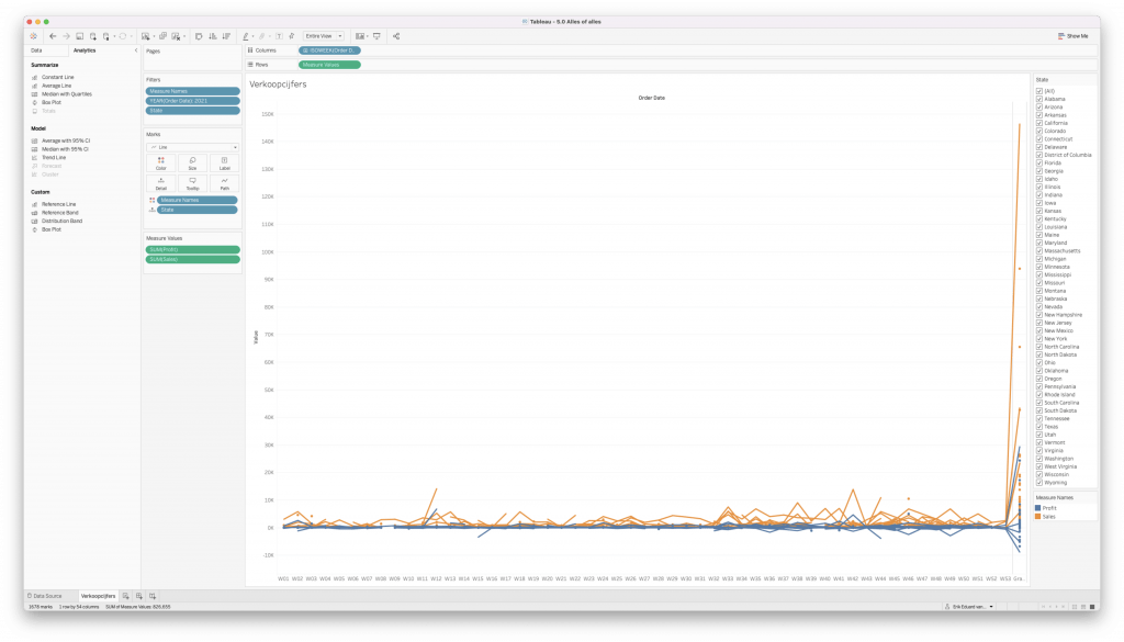 Nu wil de opdrachtgever graag zien per Amerikaanse staat wat de cijfers zijn. U sleept de dimension ‘State’ in het Marks Pane op Detail en voila: