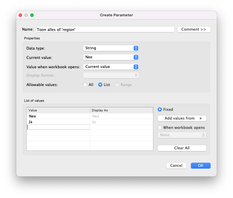 Maak een parameter aan met de naam ‘Toon alles of ‘region’ ‘ en vul hem in als onderstaand: