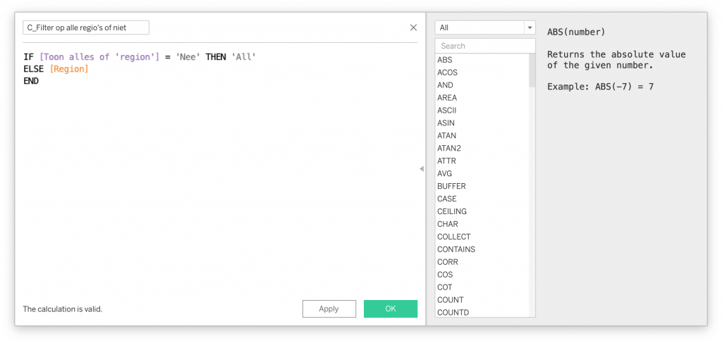 Maak vervolgens een calculated field voor de parameter ‘Toon alles of ‘region’ ‘ zoals onderstaand: