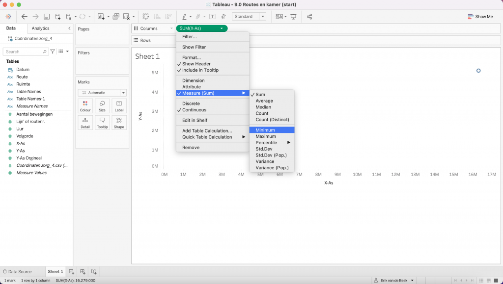 Breng vervolgens de measures in het veld die als x-as en y-as dienen. De waarden staan automatisch op SUM, dit moet aangepast worden. Klik op het pijltje omlaag en selecteer in plaats van SUM de ‘aggregate function‘ Minimum (zie onderstaande afbeelding).