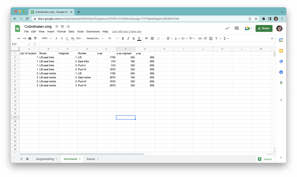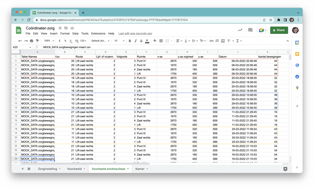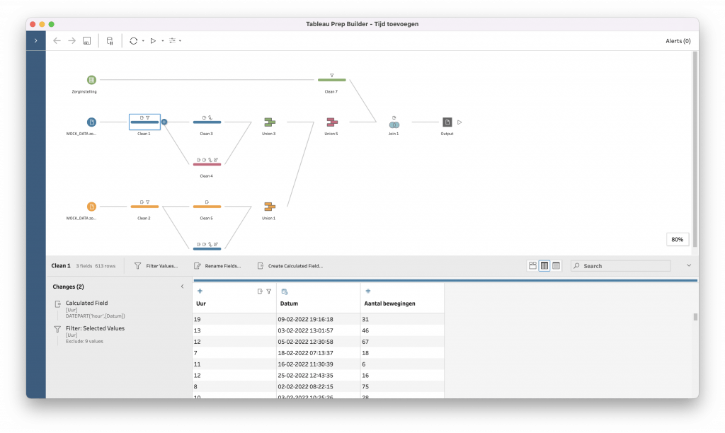 In de basis heb ik een document met enkel datetime-waarden en aantal bewegingen gekoppeld aan de looproutes (de route naar links heb ik als ‘voorkeursroute’ bestempeld voor het contrast, de route links is ‘verzwakt’ door het aantal bewegingen te vermenigvuldigen met 0,6). Uiteindelijk gaat het erom dat u, wanneer u dit nabouwt, zorgt dat voor elke tijdeenheid een koppeling is met de route. Bijvoorbeeld: voor elk uur van de dag moet een aantal bewegingen vermeld zijn dat gekoppeld kan worden aan alle vier de coördinaten. Houd er rekening mee dat dit het dataset flink vergroot. Als er uren ontbreken zal dit in de visualisatie een ‘NULL’ weergeven.