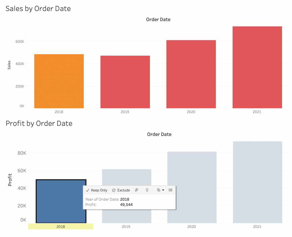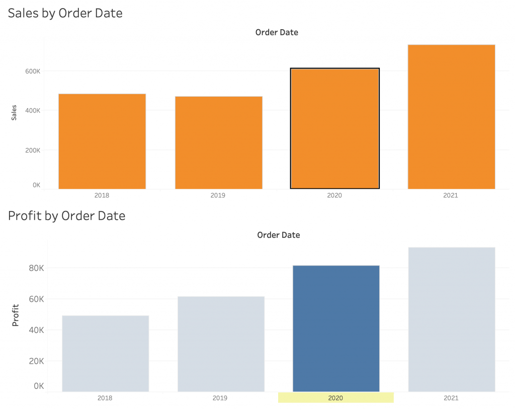 Als je in je dashboard op een jaar klikt in Sales by Order Date of Profit by Order Date, wordt het geselecteerde jaar in Sales by Order Date oranje. De andere jaren zijn rood. In de visualisatie Profit by Order Date is het geselecteerde jaar blauw, terwijl de andere jaren vaag zijn.