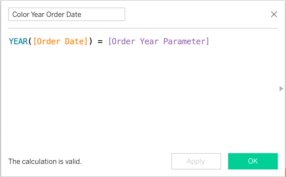 Maak een calculated field aan, waarin je de parameter koppelt aan het veld met een boolean functie. Als de parameter gelijk is aan YEAR(Order Date), is de waarde True, anders False. Dit veld sleep ik op de marks card Color.