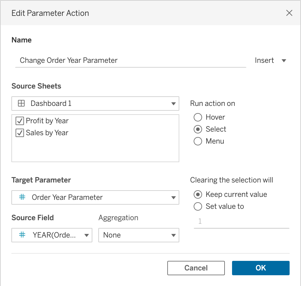 In het tabblad Dashboard, selecteer je in de menubalk Dashboard > Actions…. Voeg in het scherm je een Change Parameter actie toe en geeft deze een naam. Zo kun je de waarde van de parameter aanpassen door een veld te selecteren. In dit geval geef ik de target parameter – die we zojuist gemaakt hebben – de waarde van het bronveld YEAR(Order Date) wanneer ik deze in een van beide visualisaties selecteer. Als aggregatie kies je None.
