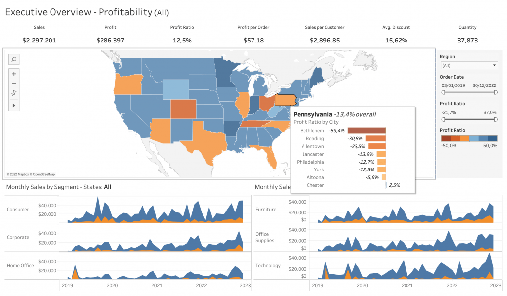 As seen in the examples above, consistent colouring is key to communicate qualitative and quantitative differences. Misuse of colour can lead to confusion. For example if you use the colour orange to categorise a dimension member as well as to show lower profit levels on another chart. It is not best practice. This element is important in what the dashboard is trying to communicate.