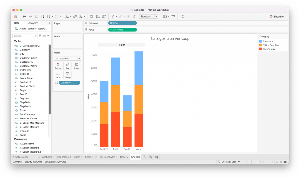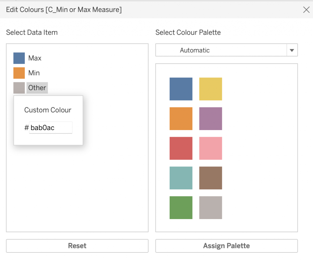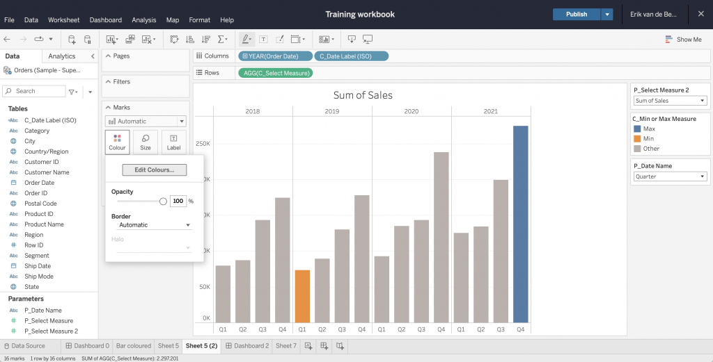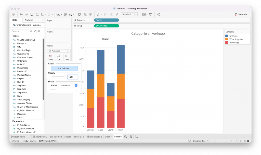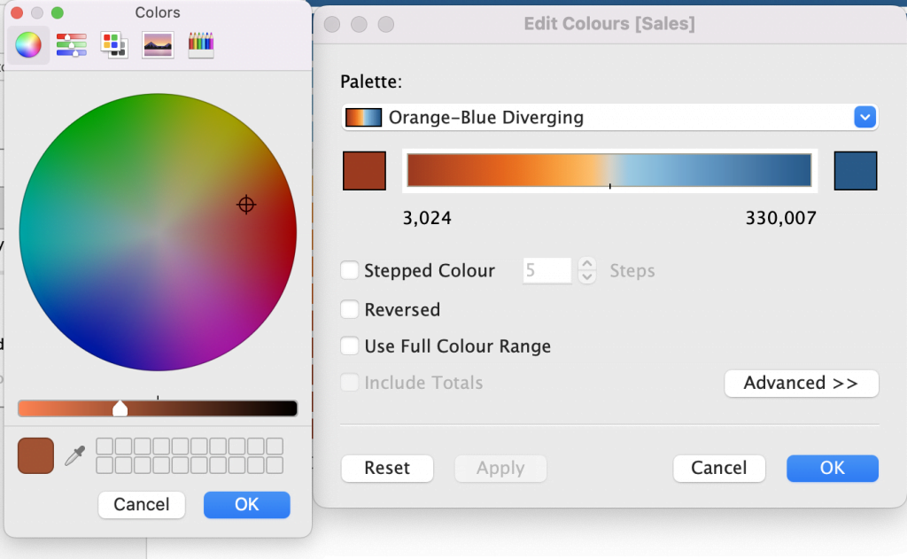 Overigens komt u bij het aanpassen van kleuren van measures meteen in een ‘Colors‘ pop-up terecht. Klik dan net als hierboven op ‘Colours‘ in de Marks Pane en klik op de kleur in het vierkant aan het uiteinde van de kleurenband.