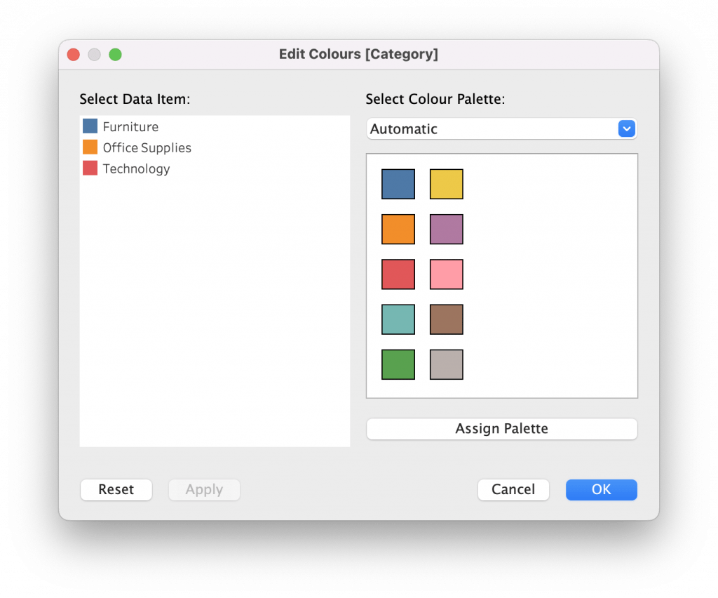 Stel u heeft een dimension in de Marks Pane op Colour gezet, maar van de drie kleuren wilt u er één wijzigen. Klik op Colour in de Marks Pane en klik vervolgens op Edit Colours.