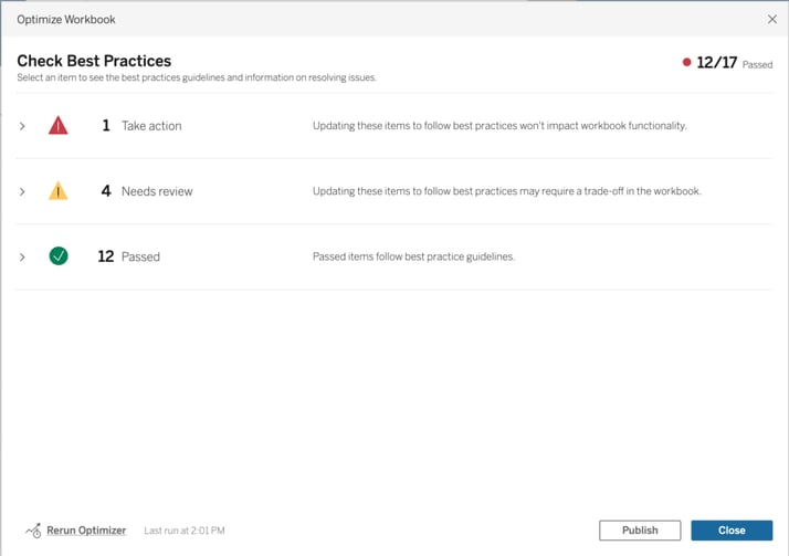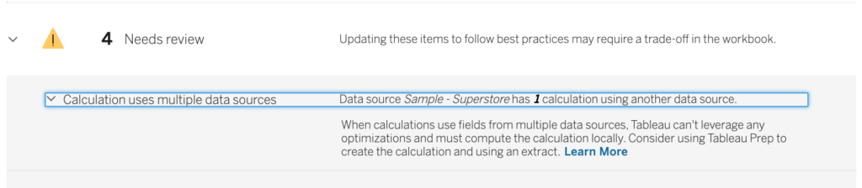 - Needs Review: Following these best practices involves modifying the workbook to more depth like restructuring the data source. They will be under “Needs Review” because they need more thought to decide if they can be applied or not.