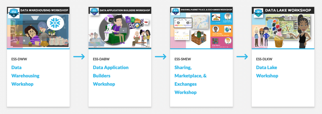 After setting up your account, it’s time to choose your preferred method of learning. If you’re entirely new to the Snowflake ecosystem, the Snowflake Essentials course might be the way for you. In four hands-on workshops, each of which awards you with a nice and shiny badge after you complete it, you will be introduced to many of the possibilities Snowflake has to offer. From basic data warehousing tasks, to creating automated API data flows, and building web pages using several partner integrations and much, much more.