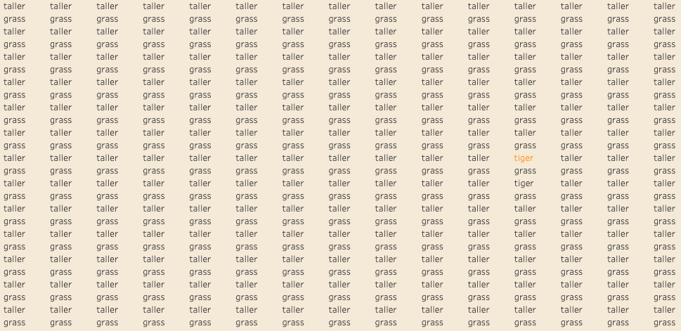 Als je het woordje tiger in het tweede plaatje eerder zag dan in het eerst plaatje, dan ben je niet de enige. “Maar dat is toch logisch?”, hoor ik je zeggen. Dat klopt. Je herkent een verschil in kleur namelijk eerder dan het verschil tussen de woorden tiger en taller. Dat is een interessant gegeven als je belangrijke informatie eruit wil laten springen in een visualisatie.