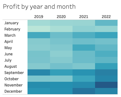 Een manier om dat duidelijk te laten zien, is door het gebruik van een highlight table (niet te verwarren met een heat map, zoals deze visualisatie vaak genoemd wordt). We zien per jaar per maand de winst van ons bedrijf. Winst is de enige waarde, dus de hoogte van het bedrag is rechtstreeks gerelateerd aan hoe donker de kleur is. Als variatie hierop kun je ook twee kleuren gebruiken, een voor de waarden onder 0, de ander voor waarden boven 0. Zo combineer je verschillende kleuren en kleurintensiteit in één visualisatie.