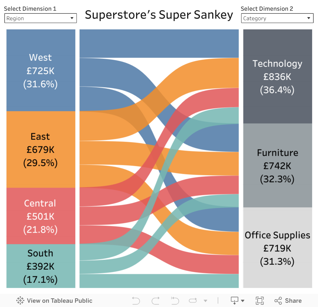 Maar wanneer het aantal marks klein is en de exacte verschillen tussen de lijnen niet belangrijk zijn, kan breedte prima ingezet worden. Een populair voorbeeld hiervan is de Sankey-diagram (door Ian Baldwin), waarin de marks als een rivier meerdere malen vertakken. In het voorbeeld hieronder gebeurt dit maar een keer, maar er zijn ook voorbeelden met verdere vertakkingen. Tot slot kan breedte ook tekstueel worden ingezet door bijvoorbeeld totalen te benadrukken.