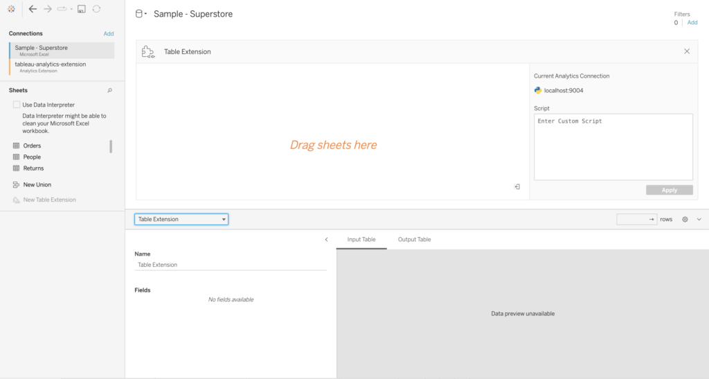 However, we can only return a field or a value. Returning multiple columns from one script or generating tables was not possible until the introduction of Table Extensions. In order to connect Tableau and the analytics extensions APIs such as “Tabpy” for Python or “Rserve” for R, we will need to establish a connection between them. For more detail about how to set up this connection as well as supporting information about analytics extensions, take a look at Passing Expressions with Analytics Extensions. Also, some further examples on Getting Started with the Analytics Extensions API.