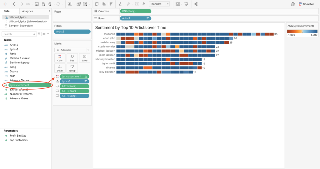 This sentiment calculation is later used as a color gradient in the following view where a positive or negative sentiment color is assigned to the top artists per song: