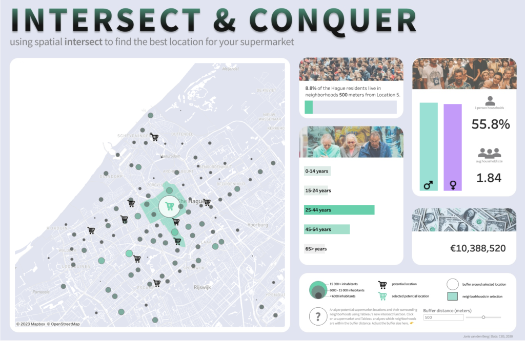 Tableau is een uiterst krachtige tool voor data-analyse. In de laatste jaren zijn er ook veel functionaliteiten bij gekomen voor ruimtelijke analyse. Een van de vele nuttige functies in Tableau is de Spatial Intersect functie. Deze functie maakt het mogelijk om twee lagen geografische data te vergelijken en Tableau te laten bepalen of ze elkaar overlappen. Hierdoor wordt een nieuwe laag zichtbaar met de overlappende geografische objecten. Vandaag geef ik een voorbeeld die je in de praktijk kunt gebruiken. We onderzoeken welke buurten binnen een bepaalde straal van een supermarkt liggen. Bekijk het volledige dashboard hier.
